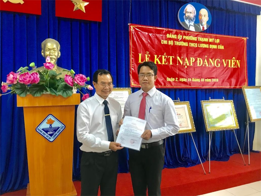 Nhân dịp kỷ niệm 73 năm cách mạng tháng tám thành công 19/8/1945 - 19/8/2018, được sự đồng ý của ban tổ chức Quận ủy quận 2 và Đảng ủy phường Thạnh Mỹ Lợi, Chi bộ trường THCS Lương Định Của đã tổ chức Lễ kết nạp cho Đảng viên mới là đồng chí Lưu Hồng Vũ - giáo viên tổ Toán - Tin. Tham dự buổi lễ có đồng chí Nguyễn Nhựt Vinh - Phó Bí thư thường trực Đảng ủy phường Thạnh Mỹ Lợi; đồng chí Trần Văn Tình - Bí thư Chi bộ, Hiệu trưởng nhà trường; đồng chí Vũ Thị Minh Hiếu - Phó Bí thư Chi bộ, Phó hiệu trưởng; đại diện các đoàn thể và toàn thể đảng viên tham dự.
